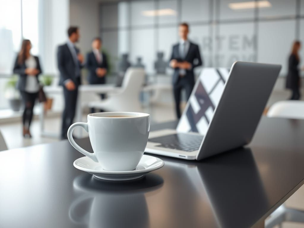 This image shows a white coffee cup and laptop on an office table. The background features blurred business people in a minimalist, modern office, rendered as digital art with a high-tech aesthetic.