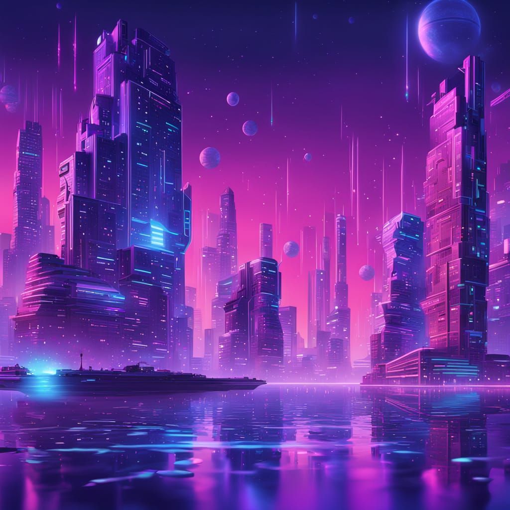 This image shows a medium shot of a floating city controlled by AI. The digital art style features neon lights, futuristic skyscrapers, and advanced technology. The color palette is a soft blue and purple gradient.
