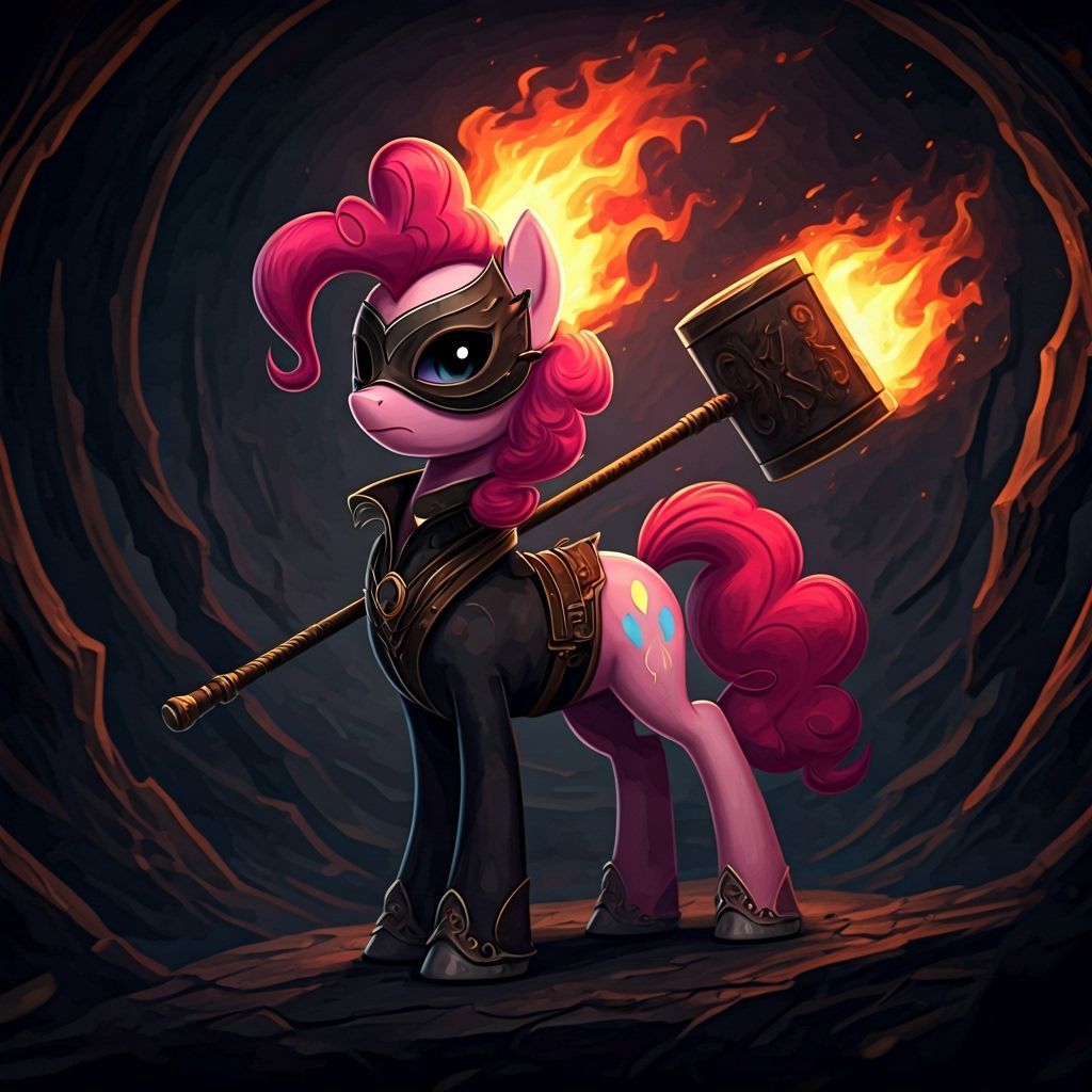 This image shows Pinkie Pie as a dark fire mage jester in pony form. The scene is a high-contrast matte painting with bold brushstrokes and fiery colors, creating a whimsical yet eerie atmosphere.