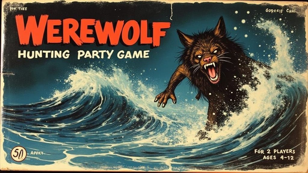 <lora:Alius:1.0> A 3/4 view of a vintage board game with box art depicting a werewolf mid-transformation, caught in a dramatic, stormy sea. The scene is rendered with a dark, vintage aesthetic, emphasizing the uncanny valley with unsettlingly realistic yet stylized features. The text “Werewolf Hunting ...