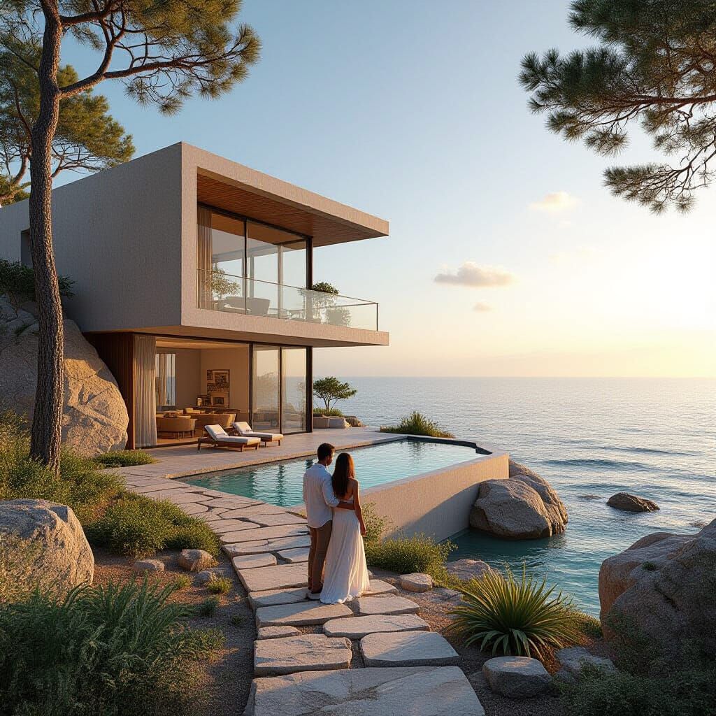 This image shows a house built on a rocky cliff, connected by a path to the sea. A loving couple is on the path. The image has a rendered aesthetic.