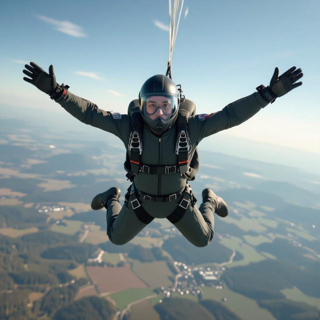 A person in a jumpsuit freefalls through the air, arms spread wide, above a serene landscape. The image blends realistic and dynamic visuals, capturing the thrill of skydiving.