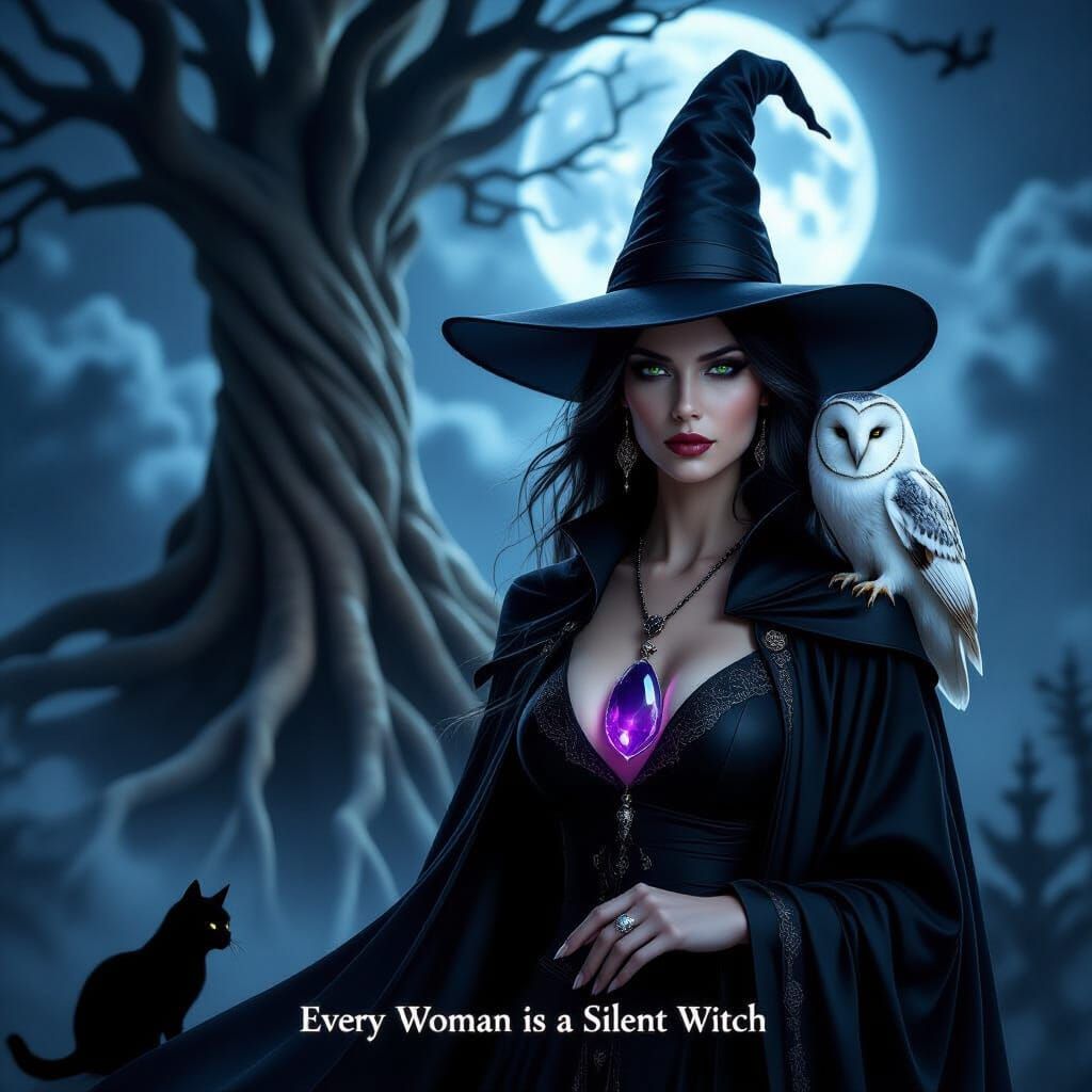 This image depicts a sorceress in a flowing black robe and pointed hat, standing by a mysterious tree with roots reaching the sky. Features cinematic lighting and a magical, ancient atmosphere.