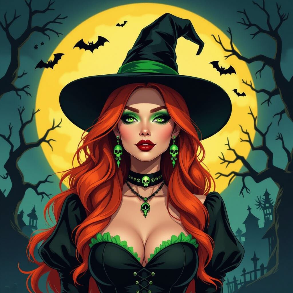 This image shows a mysterious witch with long orange hair, wearing a black dress and neon green cloak. The scene is set in a Halloween town under a full yellow moon, with bats and spooky black trees, in a Halloween aesthetic.