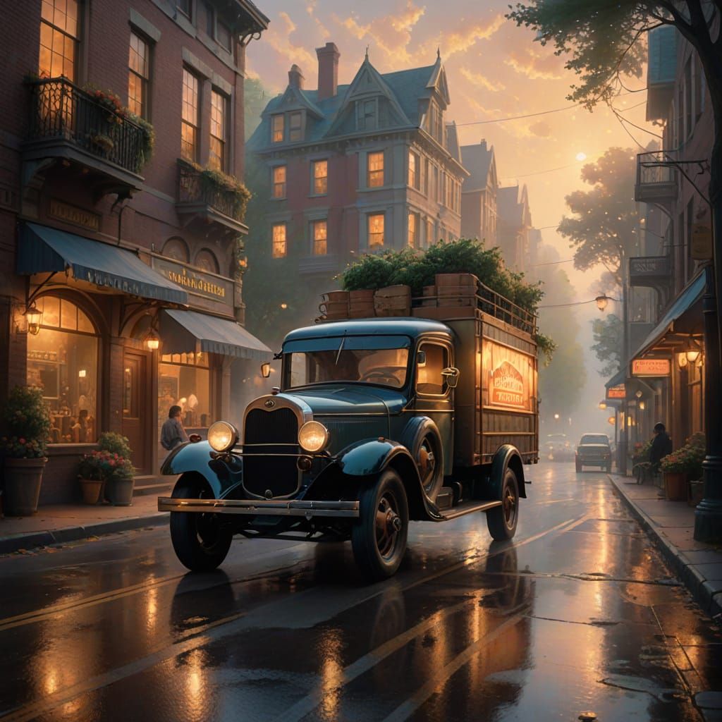 A vintage 1930s beer truck with a female driver is captured in a medium shot, driving through a street with idyllic, misty scenery. The lighting is soft and glowing, reminiscent of Thomas Kinkade's style.