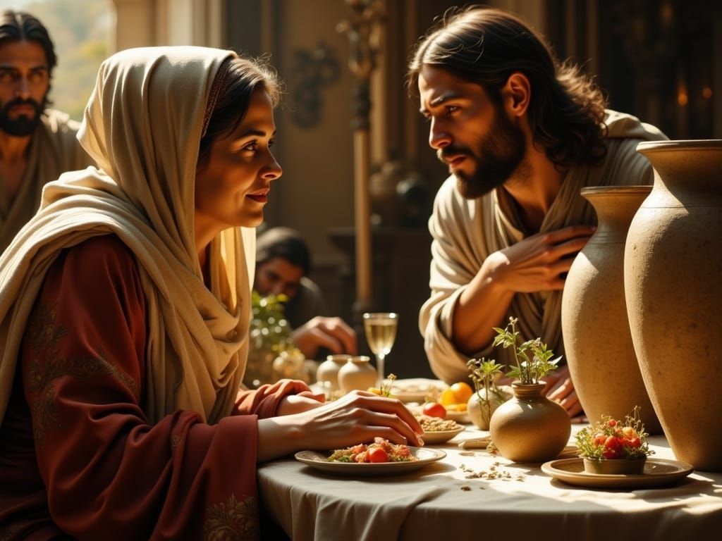 This image depicts a serene and reverent 1st-century Jewish wedding scene, with a motherly Mary speaking to Jesus amidst a lavish feast, in a style reminiscent of Renaissance masters.