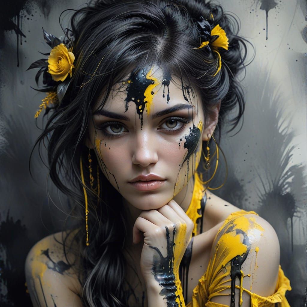 A striking portrait of a girl in black and yellow charcoal with ink drips. The artwork evokes a dreamy and pensive mood with a romantic art nouveau aesthetic.
