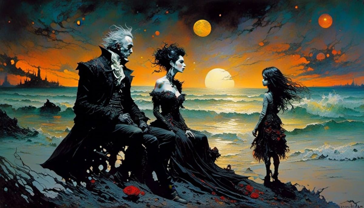 This image shows an elderly man with a younger Latina woman in a loving embrace by the seashore at sunset. The scene has the appearance of an impasto painting.