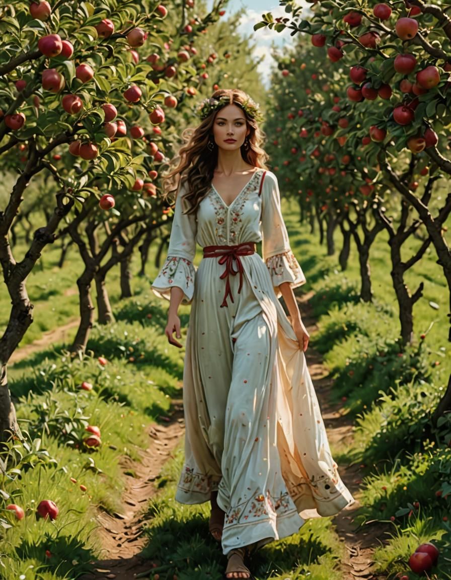 A captivating image of a goddess gracefully walking through lush apple orchards, bathed in golden light. The scene evokes a sense of serenity and natural beauty.