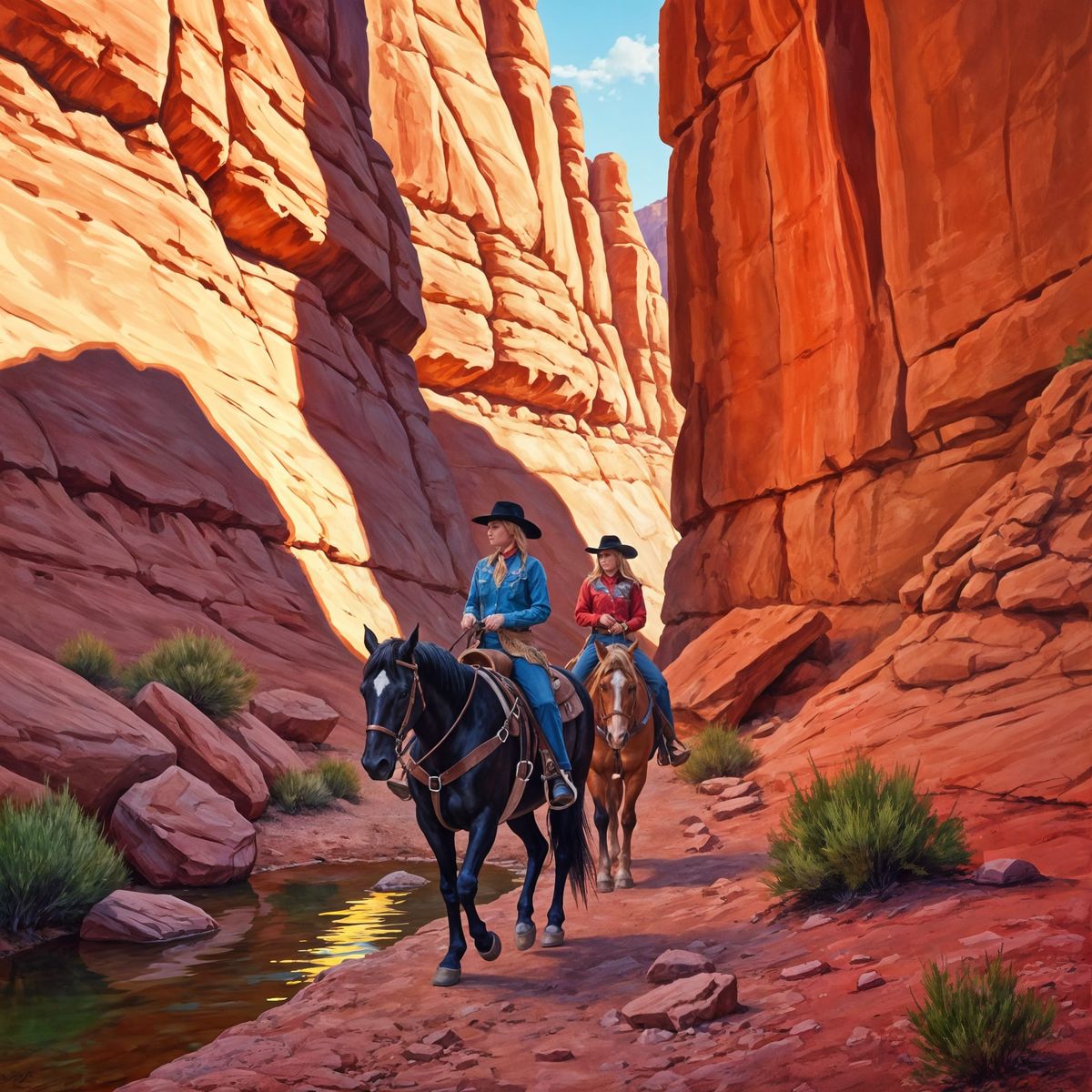 This contemporary plein air painting captures two cowgirls on horseback riding through a narrow red rock canyon. Dramatic sunlight filters through, creating striking light and shadow patterns on textured sandstone.