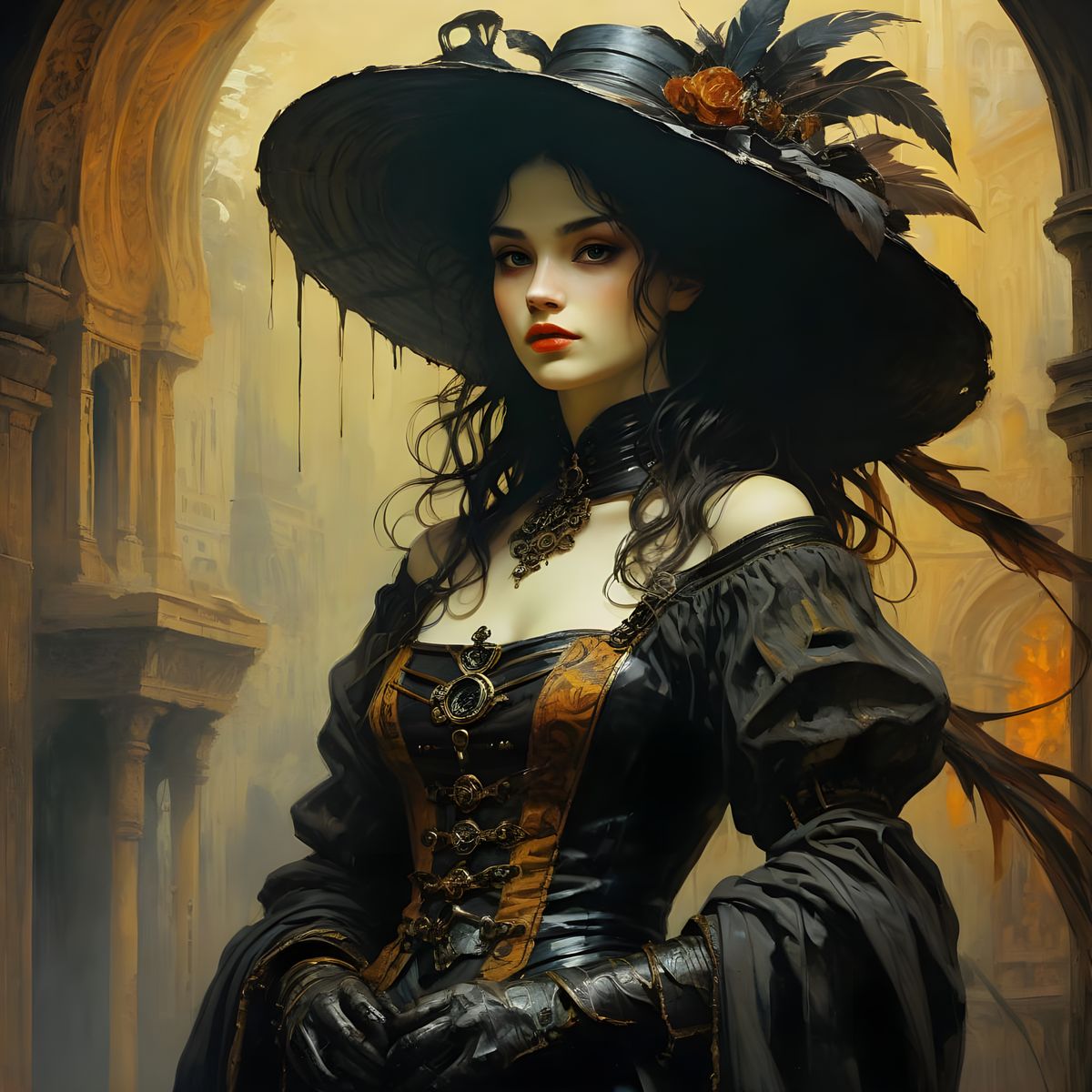 This image features a complex, dreamlike scene with warm, vibrant colors reminiscent of Claude Monet's impressionist style, blended with the darker, more mysterious elements of romanticism and dark academia.