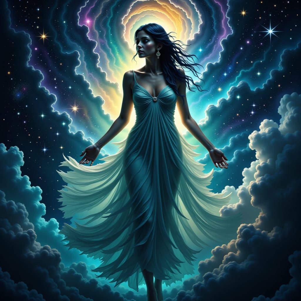 A luminous, dreamlike image of a female spirit in flowing silks dissolving into a cosmic vortex of stardust and nebulae, rendered with glowing starlight in deep blues and purples.