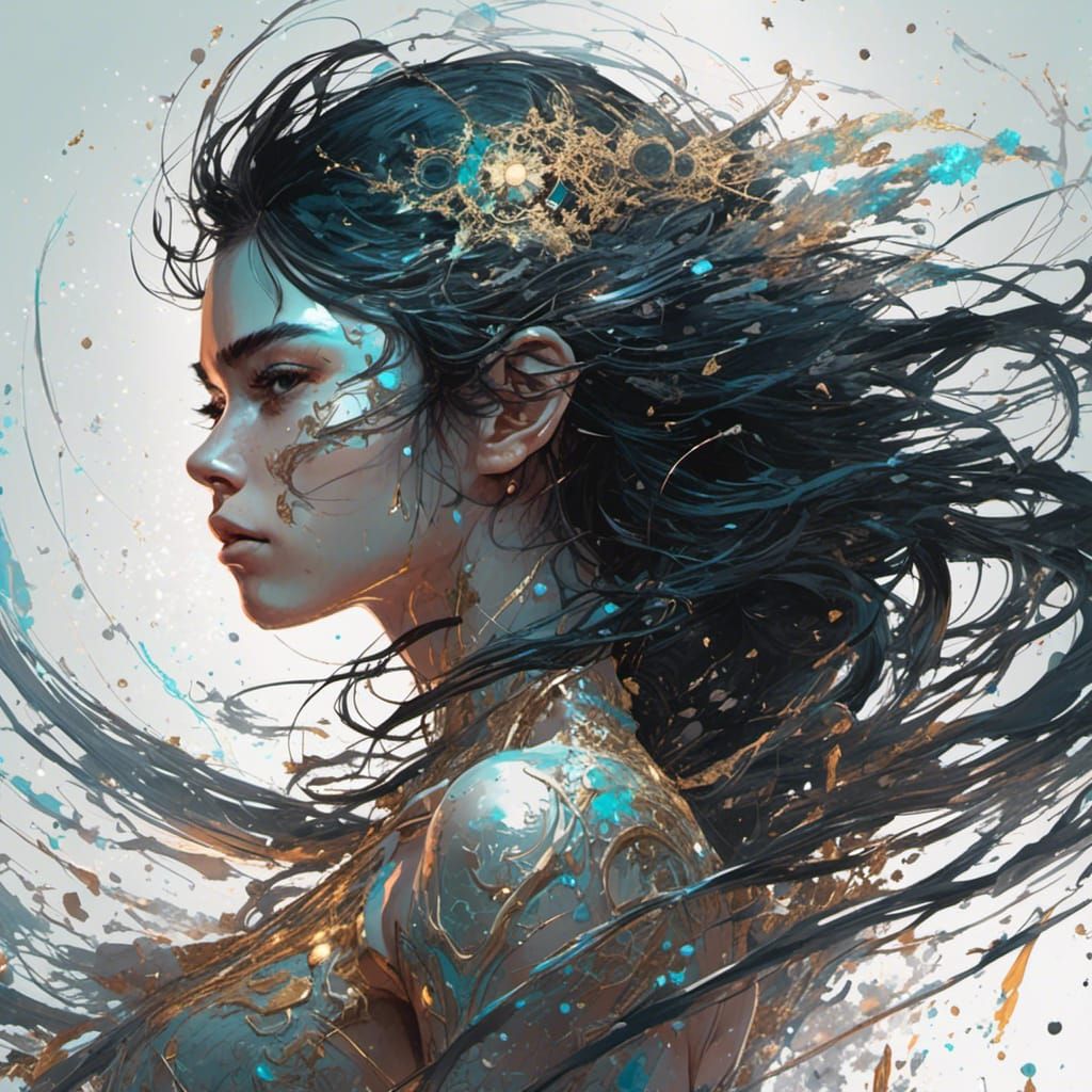 A full-body digital illustration of a woman with long, curly black hair and an athletic build, rendered in a comic style with sharp focus and intricate details. The artwork has a fantastical aesthetic.