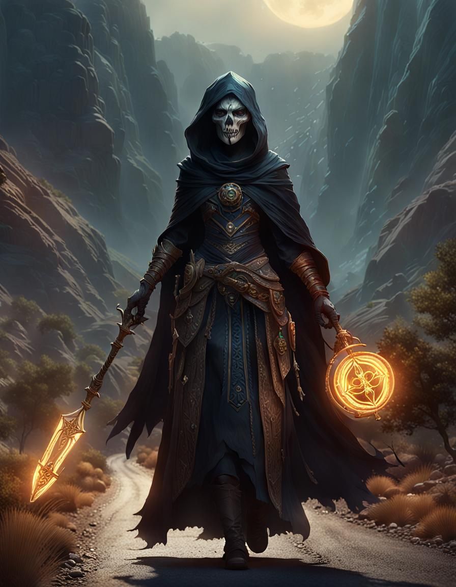 A wide shot of a death mistress on a road to heaven. The scene features dynamic lighting, intricate details, and deep colors in a dark fantasy aesthetic. The art includes red, white, and black patterns.
