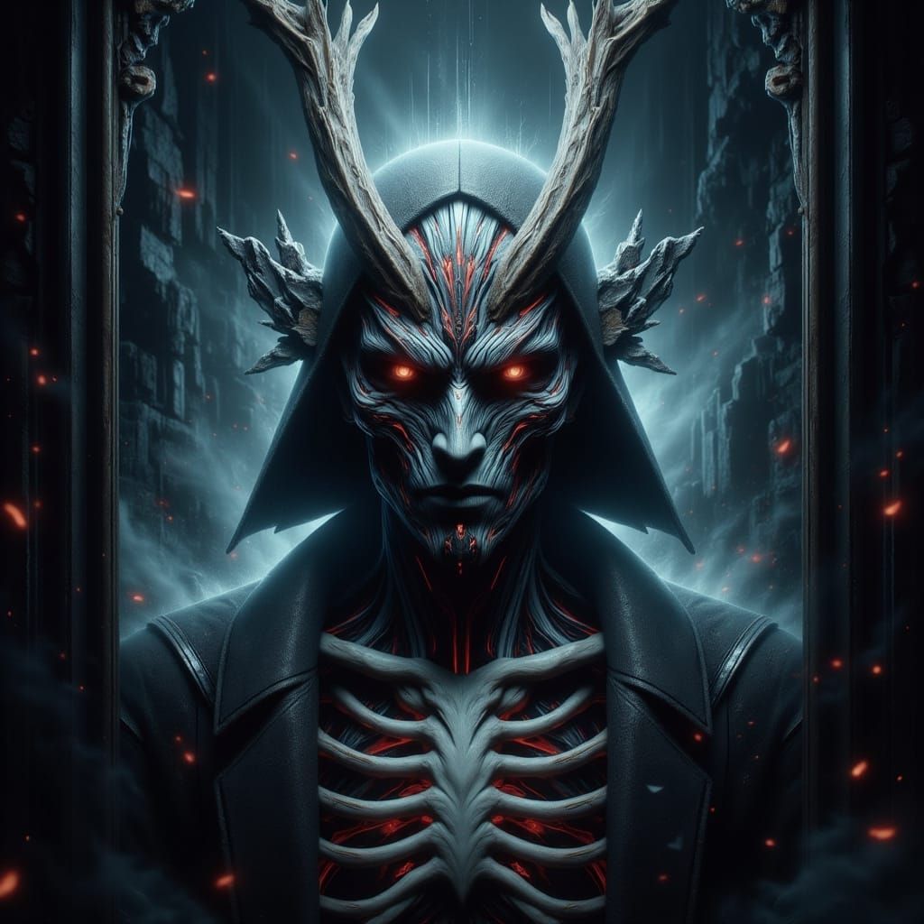 This eerie image shows a samurai's upper body with a menacing mask reflected in a misty mirror, contrasted with a skeletal lower half, set in a dimly lit, biomechanical atmosphere with surrealist and dark fantasy elements.