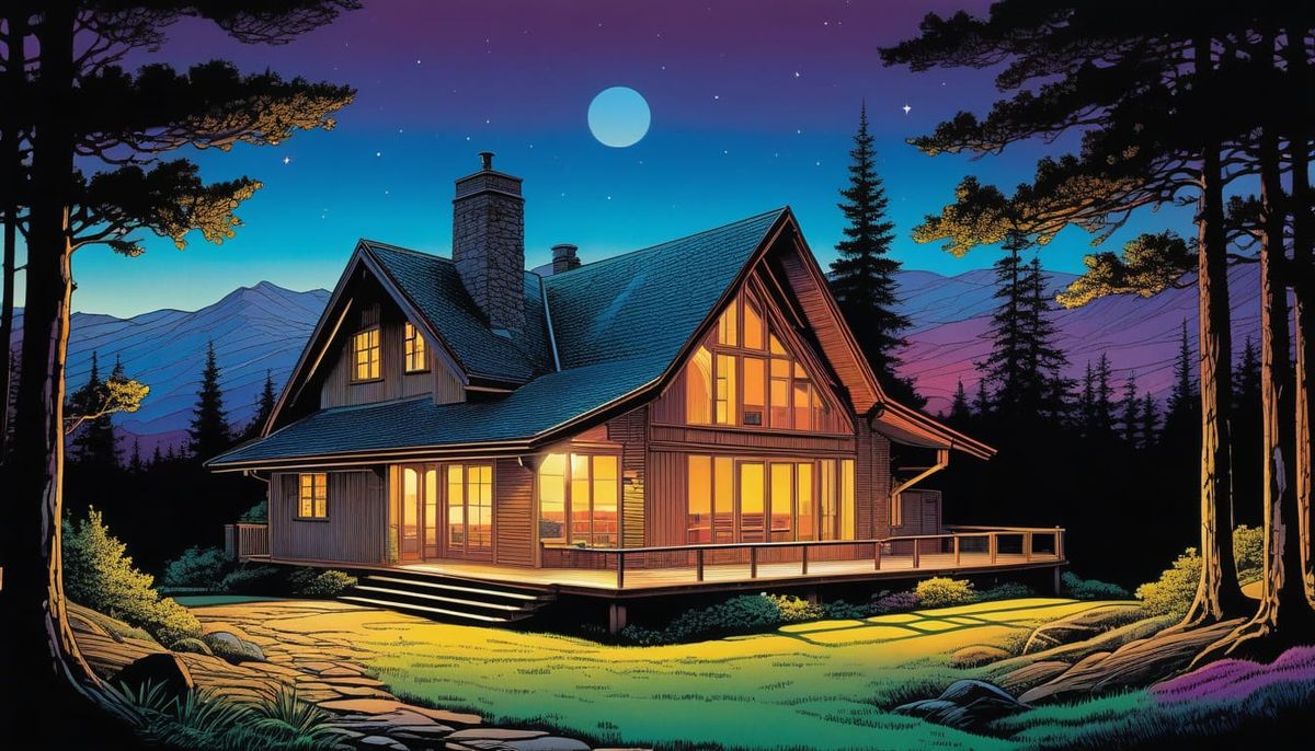 A hand-drawn digital illustration of a cottage at dusk. Laser-etched details and vintage colors create a retro, cinematic feel, reminiscent of Dungeons and Dragons art, in a half-illuminated style.
