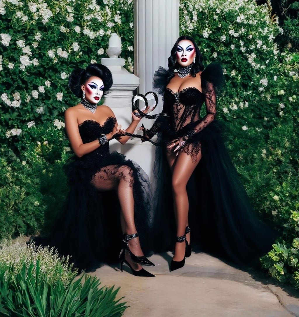 This image features two women in elaborate, goth-inspired drag queen fashion with glowing skin, holding an infinity symbol between them, representing perfect synchronicity.