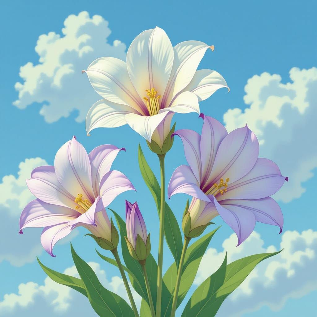 This image shows Bitterroot flowers with narrow petals that softly shift from white to pink and purple, set against a blue sky with white clouds. The artwork is in a watercolor style with detailed shading.