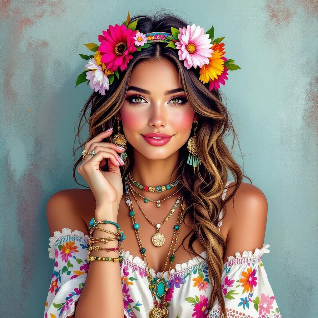 Easily generate your own boho woman images with floral headbands and eclectic clothing. Free and fun AI art creation!