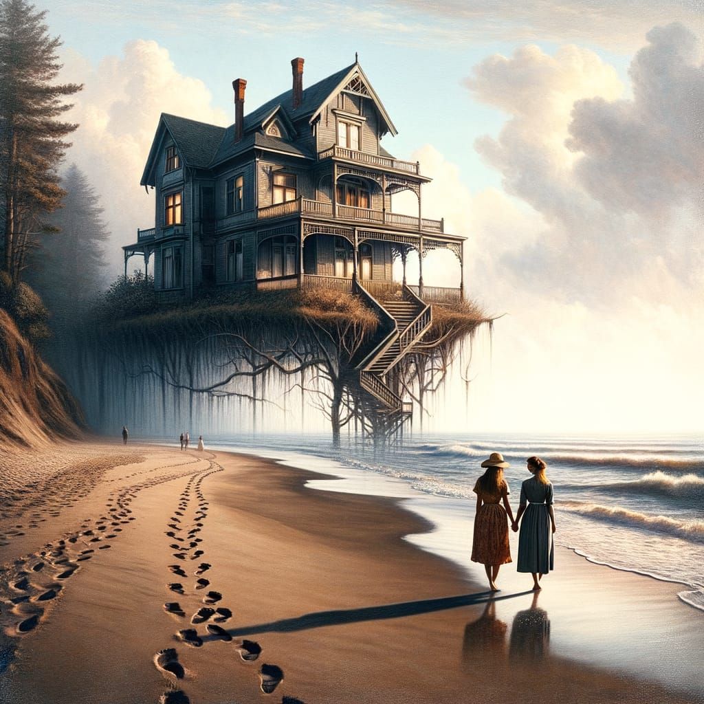 A double exposure oil painting shows two women on a beach, overlaid with an ominous house on a hill with a 'Keep Out' sign. The eerie house contrasts with the serene beach scene.