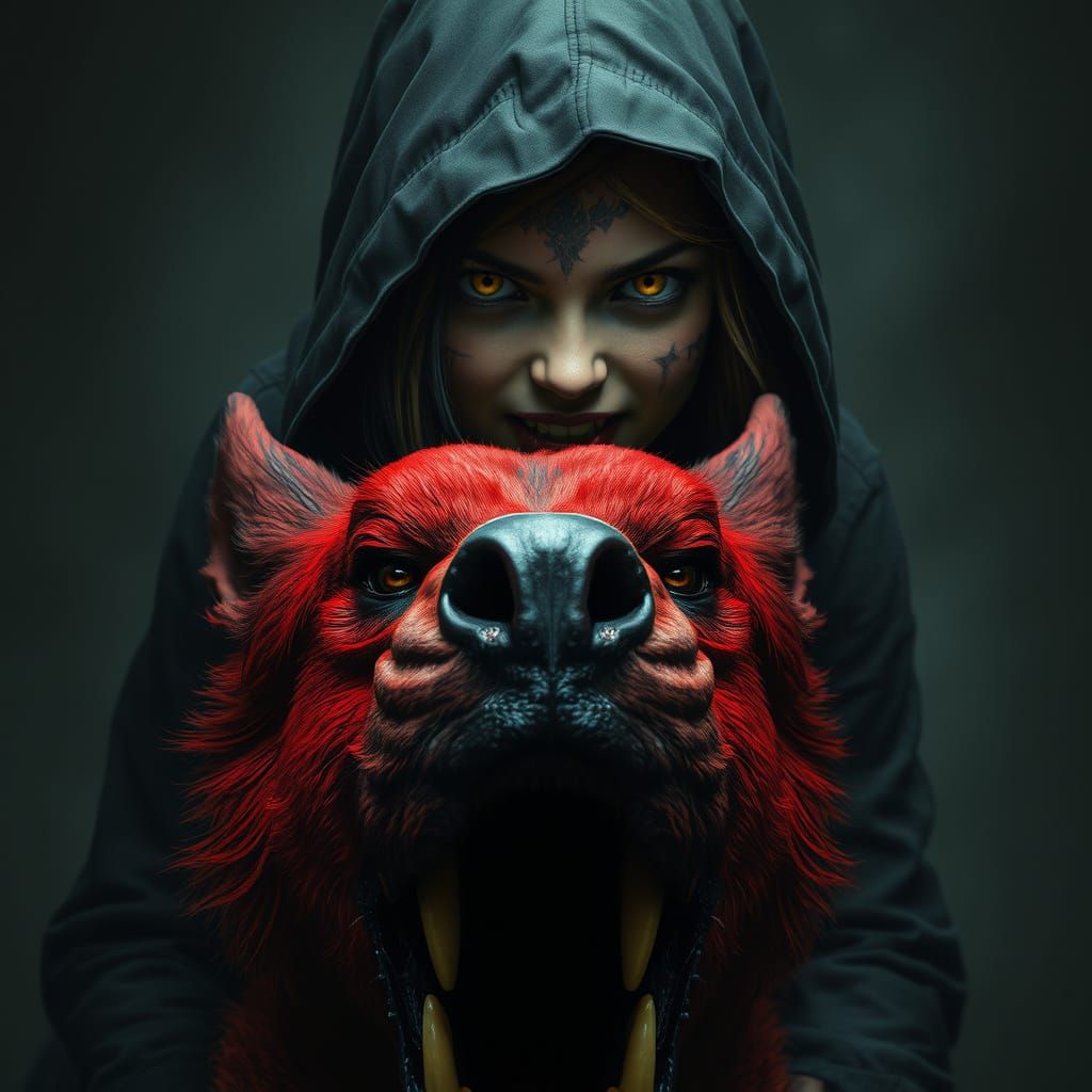 A sinister, hyperrealistic portrait of an angry girl with fangs and yellow eyes, riding a red hellhound. Shrouded in darkness with a grainy, moody aesthetic.