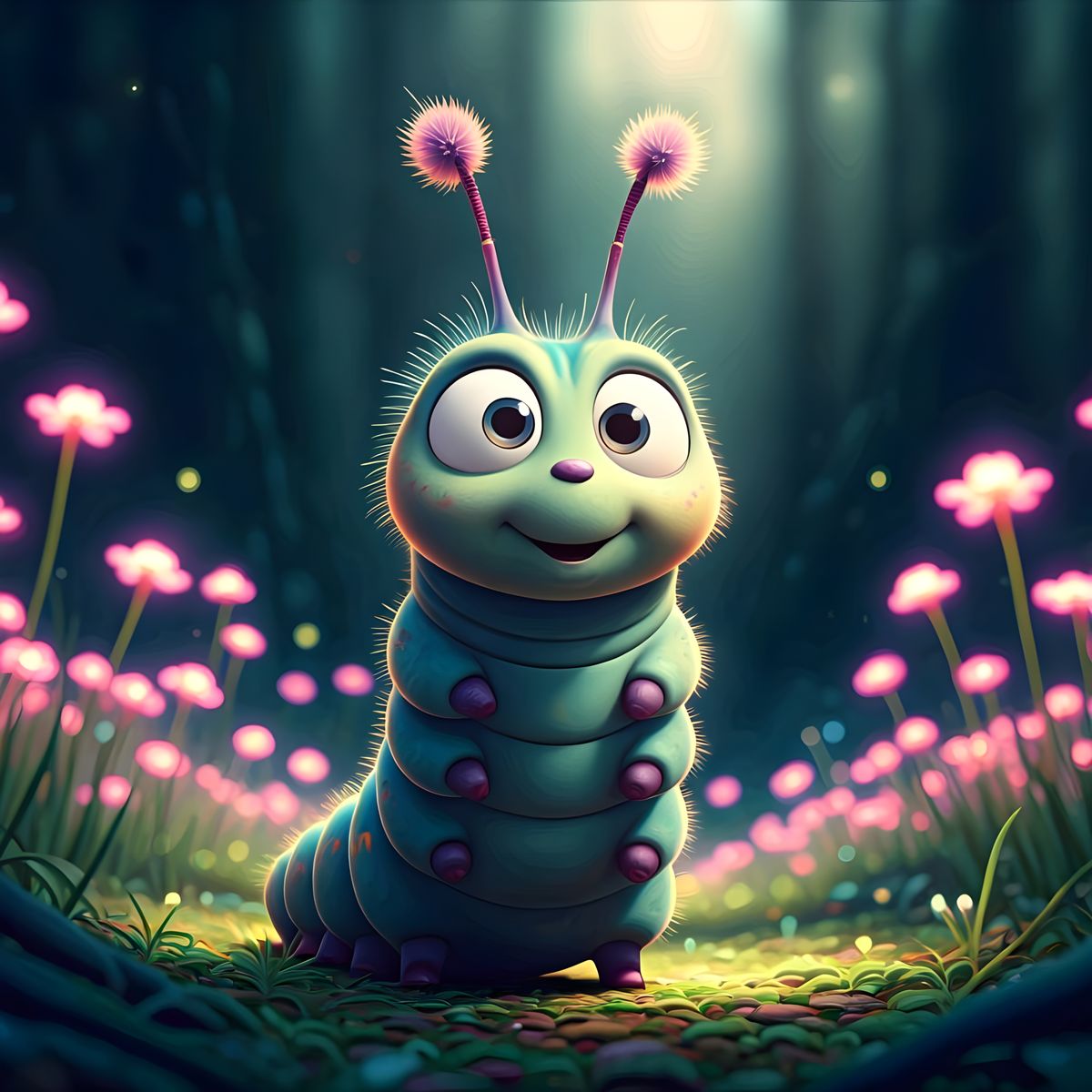 A 3D rendered, Pixar-style caterpillar stands in a glowing field within a magical forest. This digital art piece features soft focus, vibrant colors and a bright, radial gradient background.
