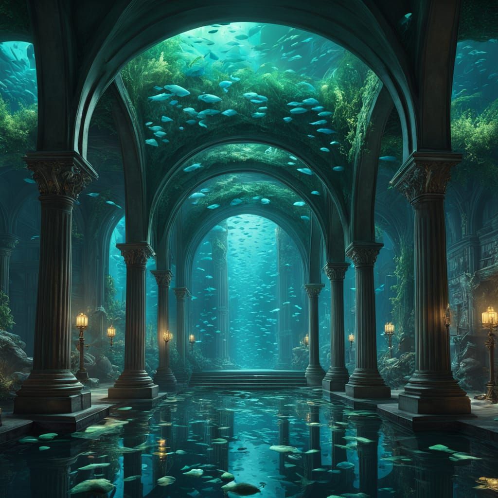 This image depicts a surreal underwater city constructed from luminous sea glass, with bioluminescent fish navigating intricate glass archways. It's a detailed digital matte painting with a dreamlike, fantasy aesthetic.