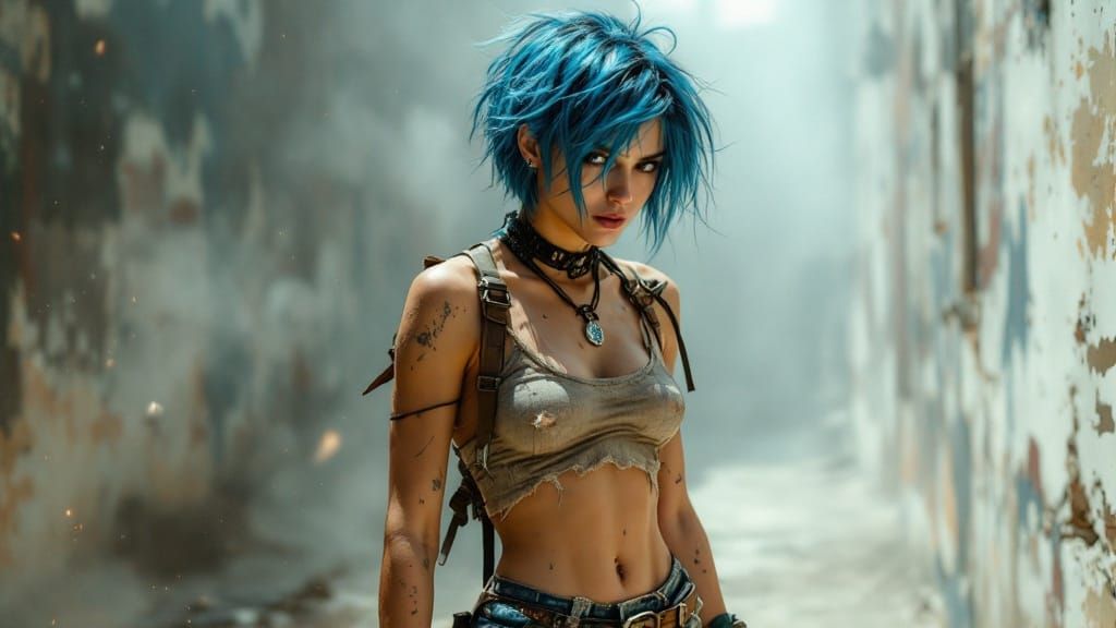 This image combines classical Renaissance subtlety with dynamic, post-apocalyptic chaos. A striking young woman stands defiantly, her blue hair styled in a messy cut, amidst a backdrop of disintegrating layers and swirling data points.