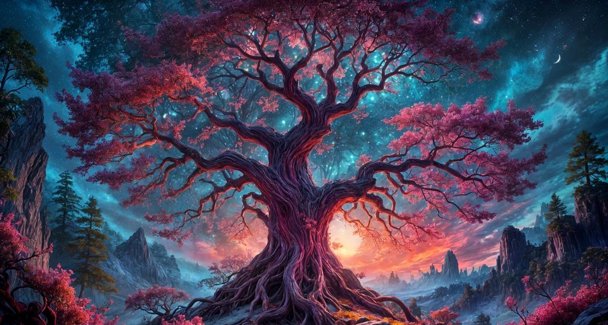 This stunning oil painting captures a magical tree in a dreamlike fantasy forest, with intricate filigree and vibrant, swirling colors creating an ethereal atmosphere. The glazing technique adds depth and richness to the luminous, cinematic scene.