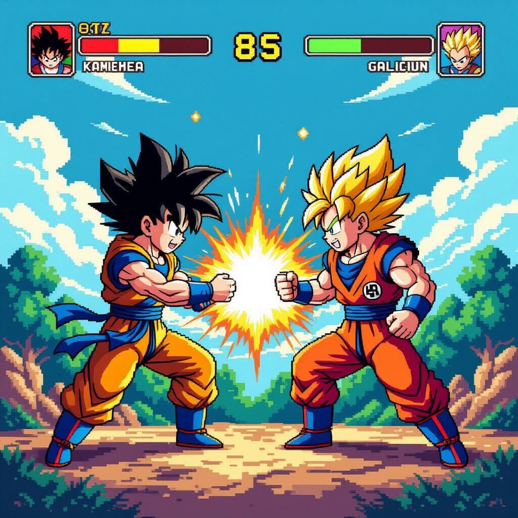 This image features Goku and Vegeta in a dynamic 8-bit pixel art clash, inspired by 1980s arcade games and early Nintendo art. Witness their signature energy attacks colliding in a vibrant, retro style.