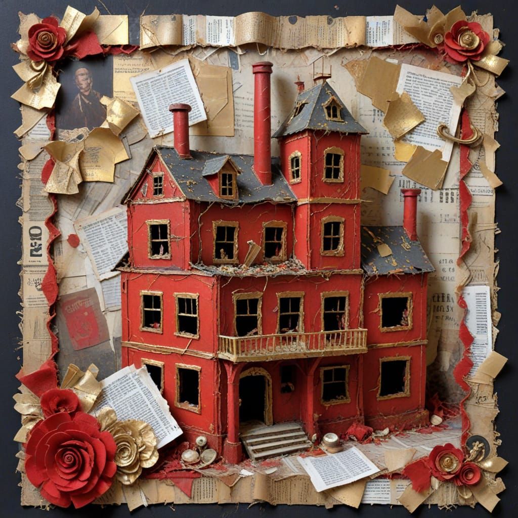 A colorful, textured scene of a red, abandoned toy factory with gold accents, reminiscent of a scrapbook page with torn newspaper frills, created in a warm, oil paint aesthetic.