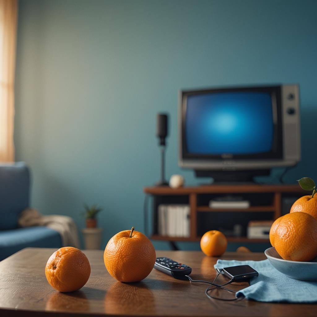 A still life photograph of a sad orange watching TV in a blue room. The image features natural light, a warm color palette, and soft bokeh, creating a relaxed atmosphere.