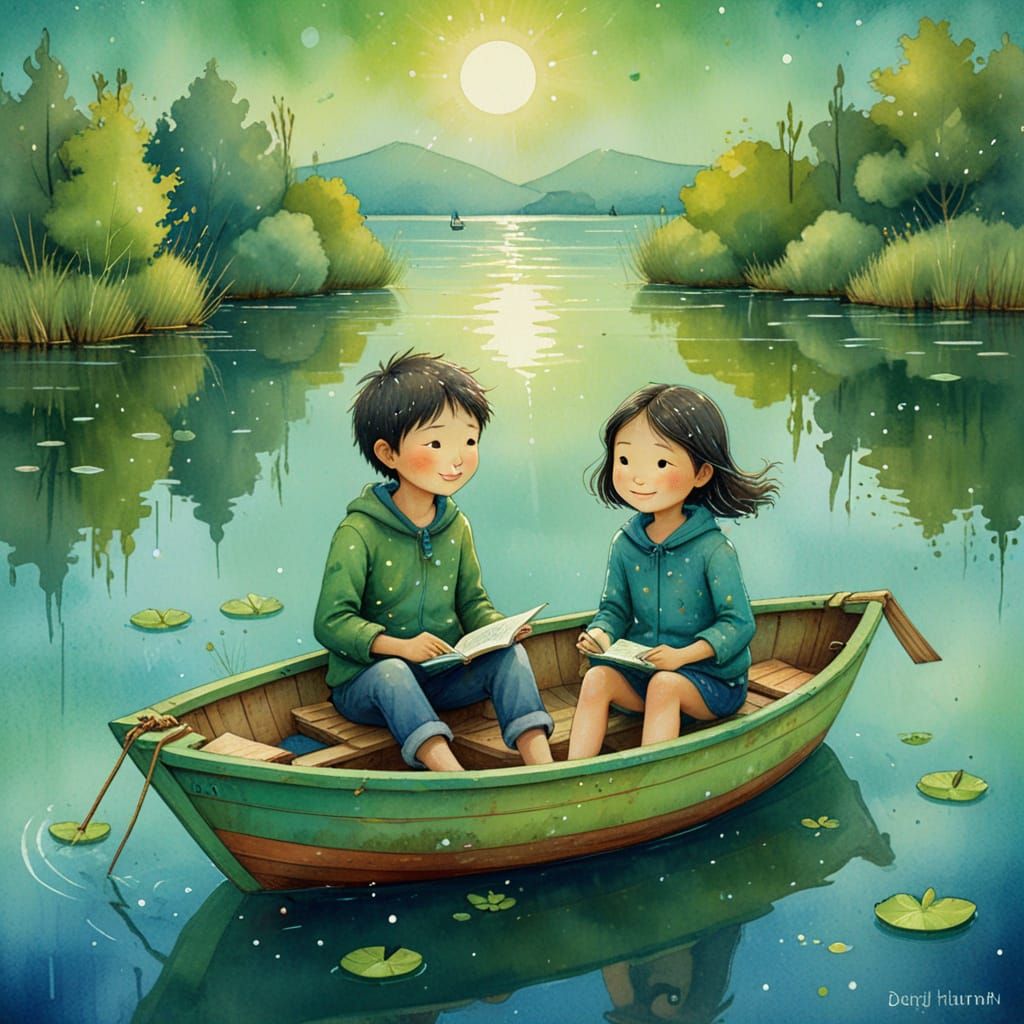 A whimsical watercolor illustration reminiscent of a children's book, showing two cheerful friends in a small boat. The image employs art brut techniques with vibrant colors and expressive brushstrokes.