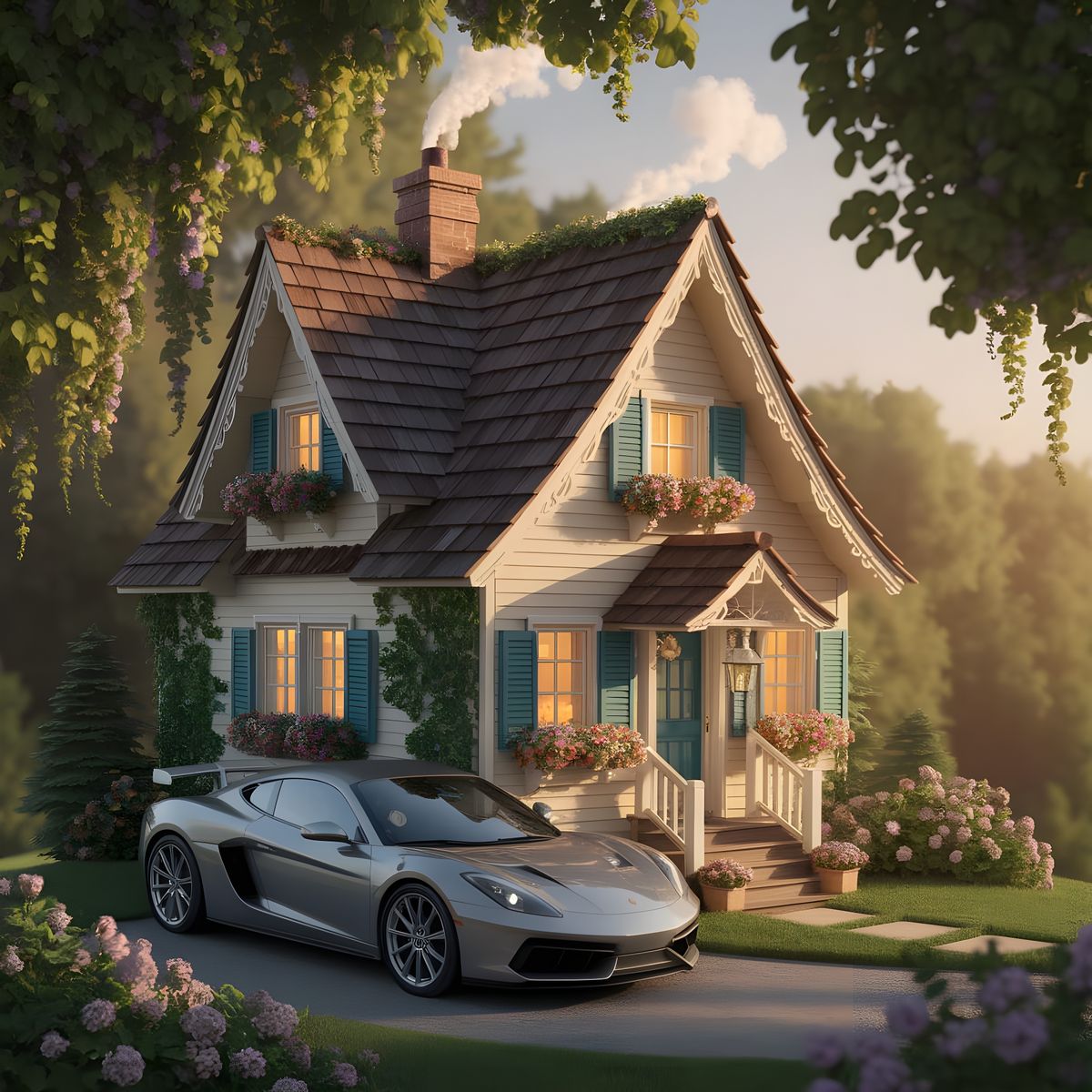A hyperdetailed, fantastical image of an extravagant birdhouse mansion nestled in a vibrant forest clearing. A sports car is parked outside, with flower boxes, lush greenery, and a smoking chimney adding to the homely scene, rendered with a golden glow.