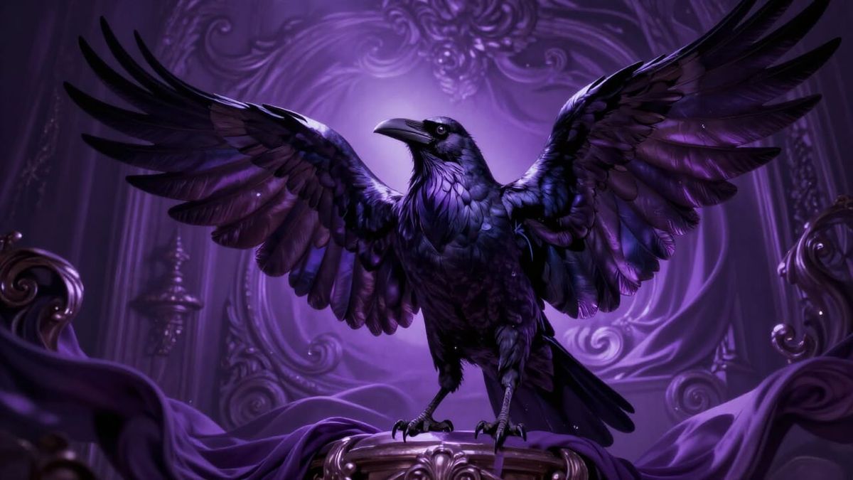 This image shows a majestic raven in a Baroque style, dramatically lit with intense purple tones. Its wings are spread in a theatrical pose against ornate shadows and swirling drapery, creating an opulent and moody scene.