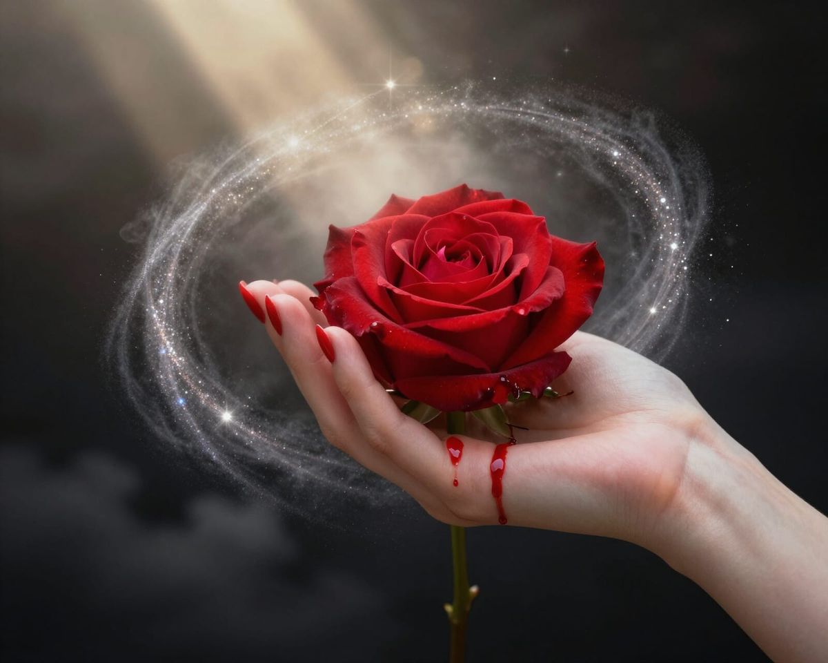 This image shows a large red rose held in a woman's hand against a celestial background. Glitter swirls around, with divine sunbeams and a soft focus effect.