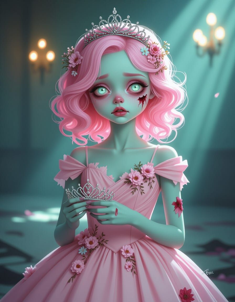 A melancholic zombie girl in a torn 1950s prom dress with dried flowers, holding a broken tiara in an abandoned ballroom. Ethereal lighting and a dreamy, pastel vintage mood.