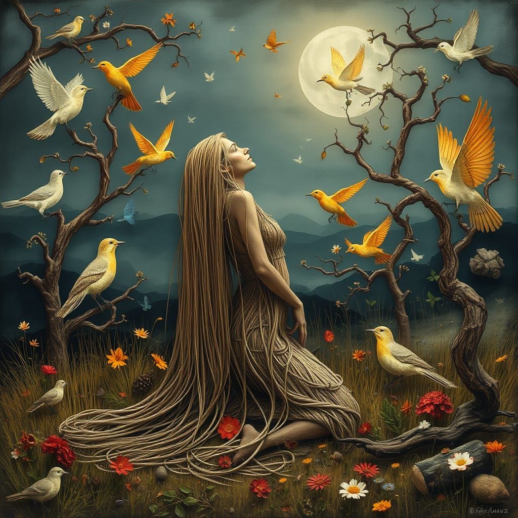 This image shows a woman kneeling in nature, her body formed from woven natural materials. Glowing mythical creatures surround her in this bio-art collage, with bold colors and intricate textures.