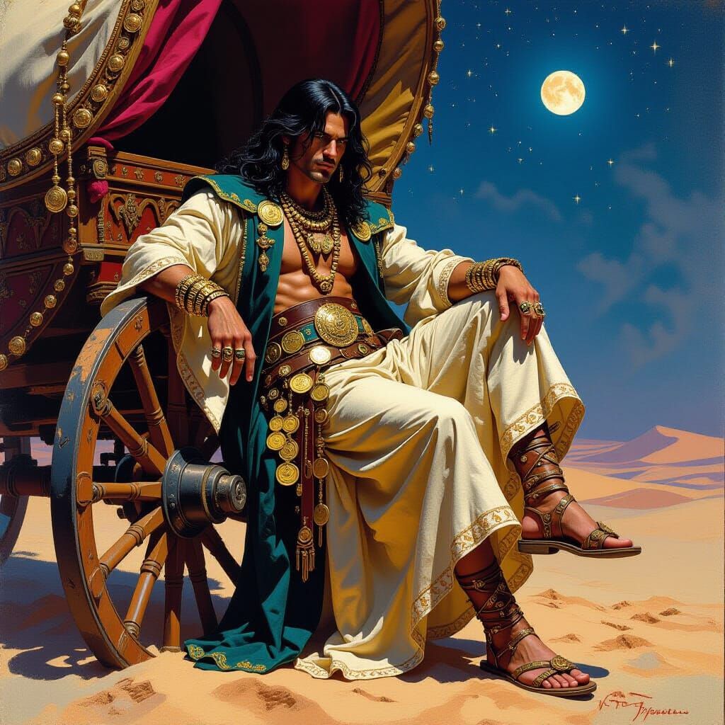 A striking picture of a caravan leader in elaborate robes under a desert sky. The character is adorned with jewelry and leans against an ornate wagon, rendered with rich textures in a dark fantasy aesthetic.