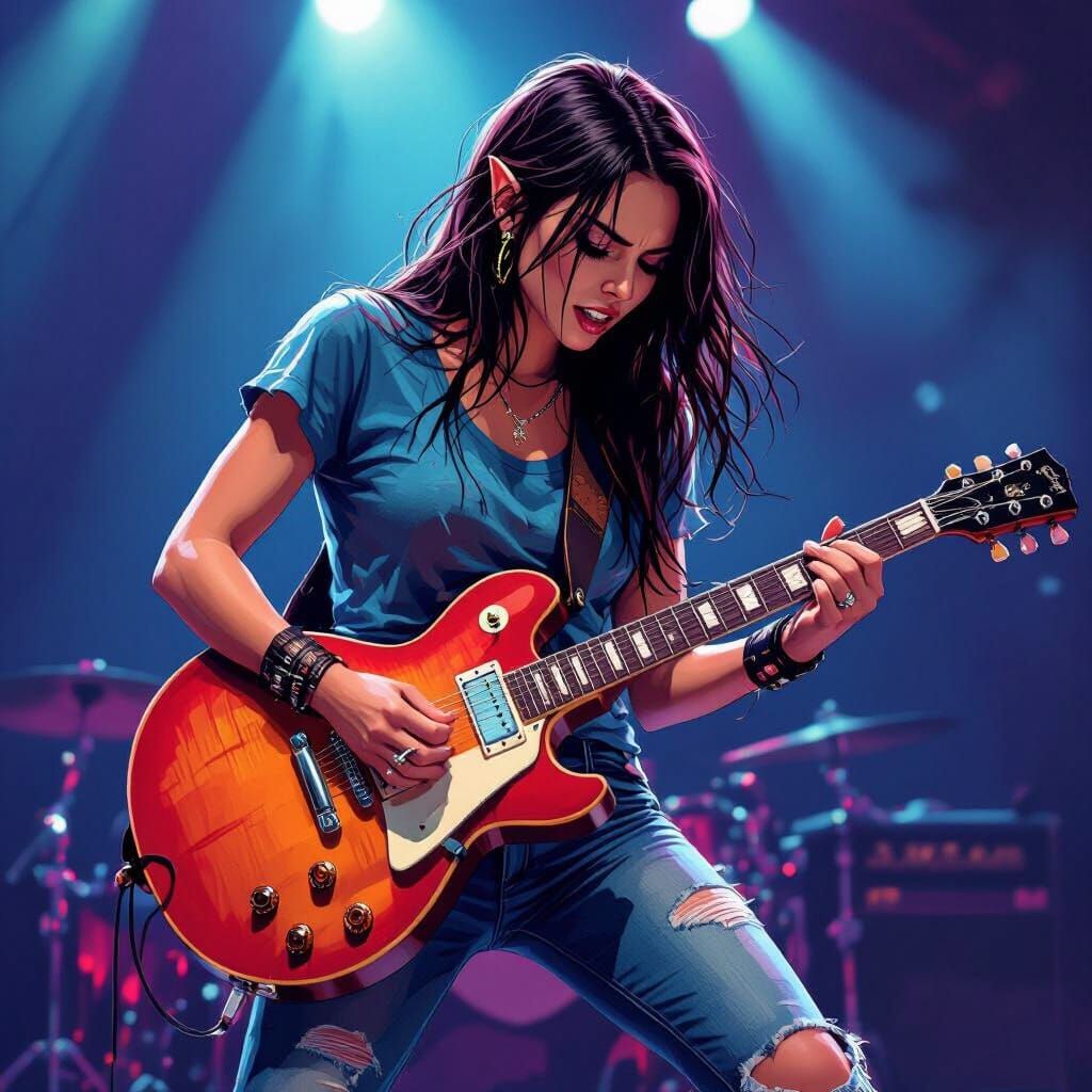 A female elfin guitarist passionately plays an electric guitar on a vibrantly lit stage. This energetic image captures a rock concert feel with dynamic shadows and sweat detail, rendered in a bold, realistic style.