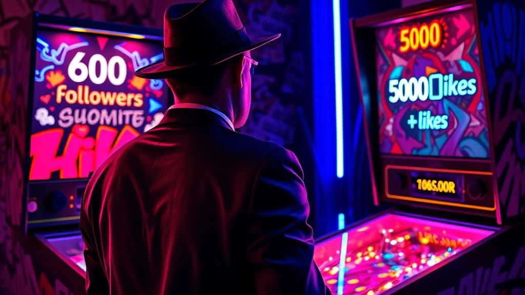 This image depicts a man in a suit playing a graffiti-themed pinball machine, celebrating 600 followers and 5000 likes. Features dynamic neon lighting and a cyberpunk concept art style.