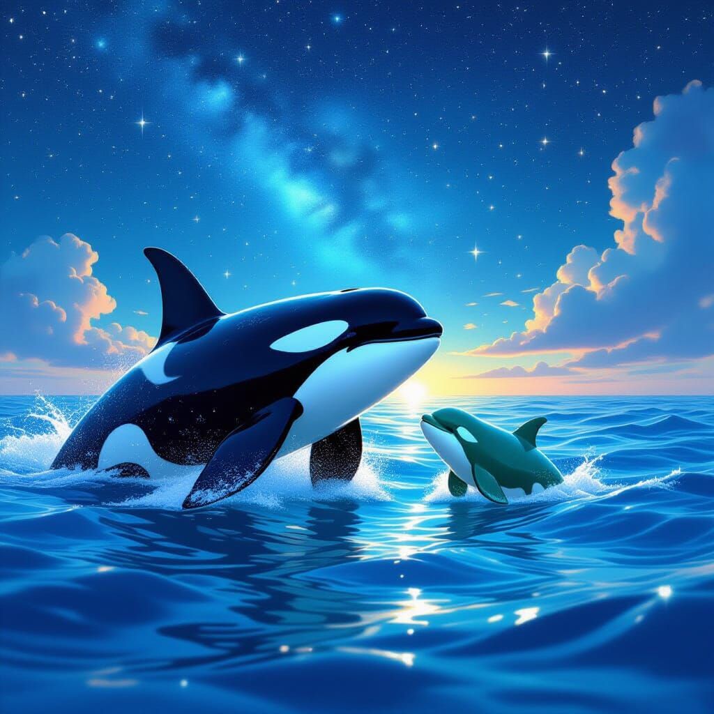 A captivating image of an orca mother and her calf swimming together in the ocean under a starlit sky. The artwork is rendered with elegant lines and luminous colors in a hyperrealistic fantasy style.