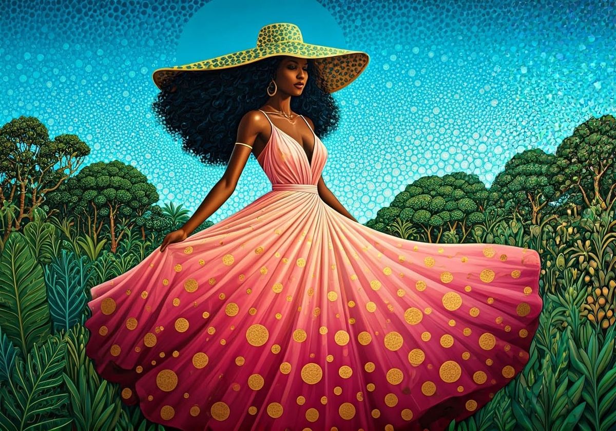 A beautiful Black woman in a pink ombre dress and gold hat with emerald accents twirls against a vibrant, polka-dotted background. Inspired by ornate, symbolic, and decorative art styles.