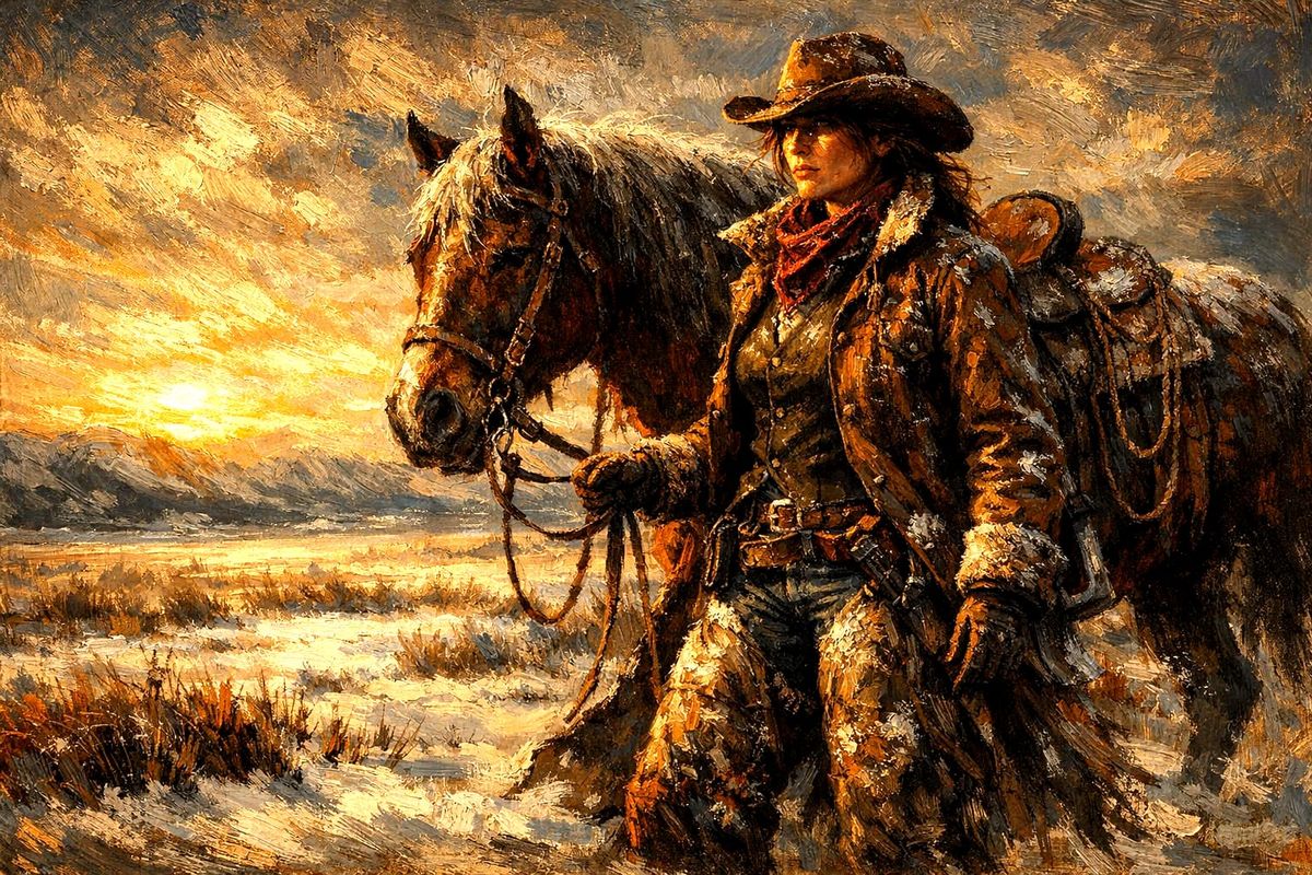 painting. A determined cowgirl with weathered skin and a worn leather hat, standing in a vast, snow-covered prairie at golden hour. The light catches the frost on her chaps and the subtle texture of her horse's mane. Dramatic lighting, cinematic wide shot, award-winning photography, extremely detailed, ...