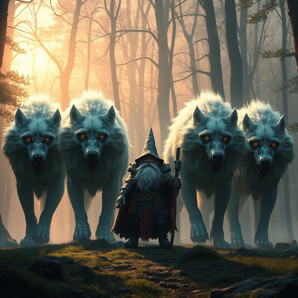 This image shows a gnome druid in a forest, accompanied by four spectral dire wolves. The artwork features deep colors and intricate details, rendered as fantasy concept art.