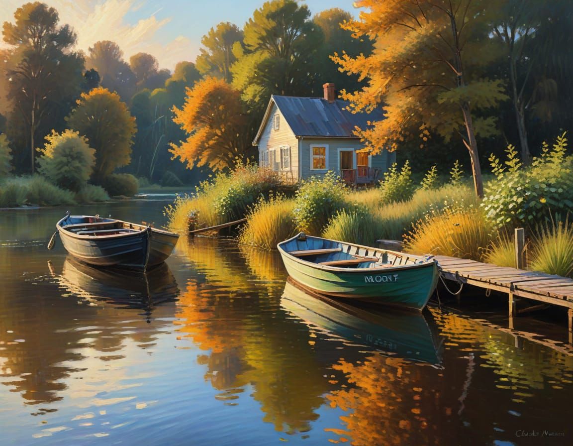 This serene oil painting captures the warm, golden light of late summer as it dances across the water's edge, reflecting off the lake's surface and illuminating a charming cottage with a wooden dock and aluminum boat.