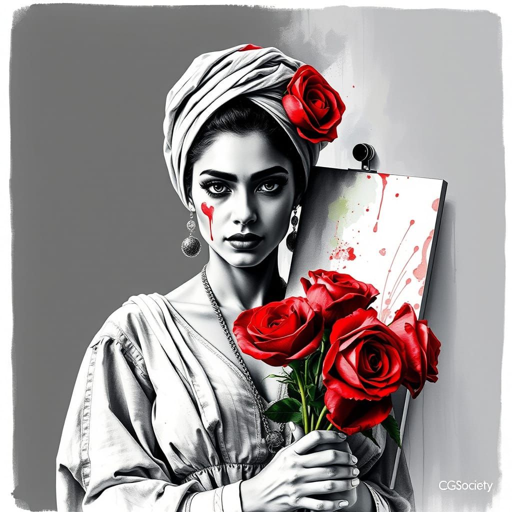 A low contrast portrait of Frida Kahlo holding red roses and a canvas. This striking artwork is rendered with graffiti and street art elements in a colorful, ultra-detailed style.