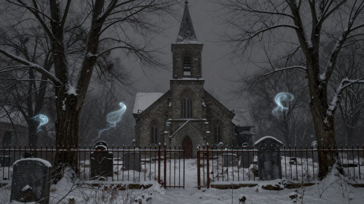 This dark, atmospheric painting depicts an abandoned 1800s graveyard covered in snow, with spectral lights among skeletal trees and an iron fence. Evokes a melancholic mood.