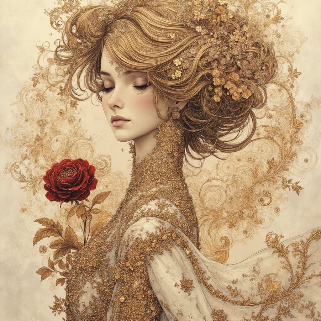 This image shows Belle holding a single rose. The artwork features a layered and intricate pen and ink drawing style with hyper detailed elements, enhanced with alcohol inks.