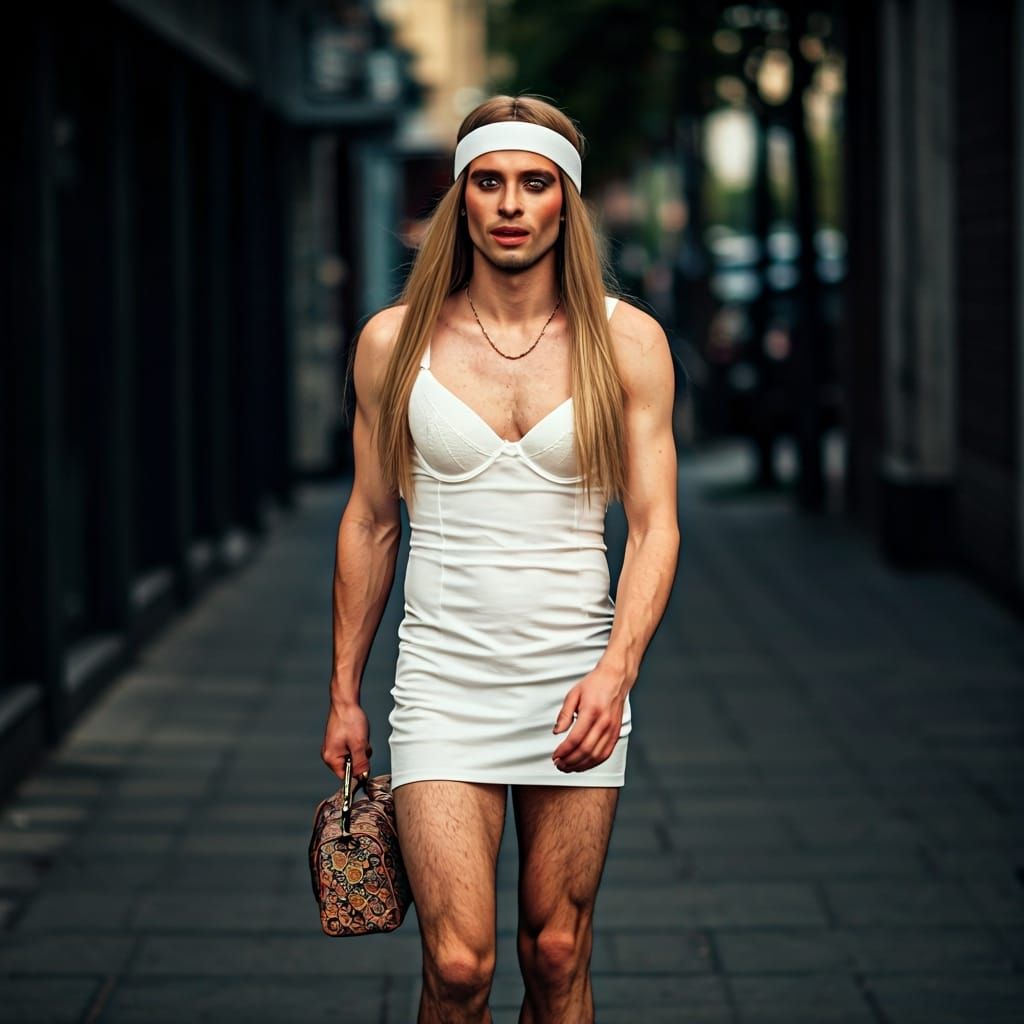 This image shows a young man in a minidress and matching accessories, looking embarrassed while walking. It features a cinematic film aesthetic with color grading and film grain.